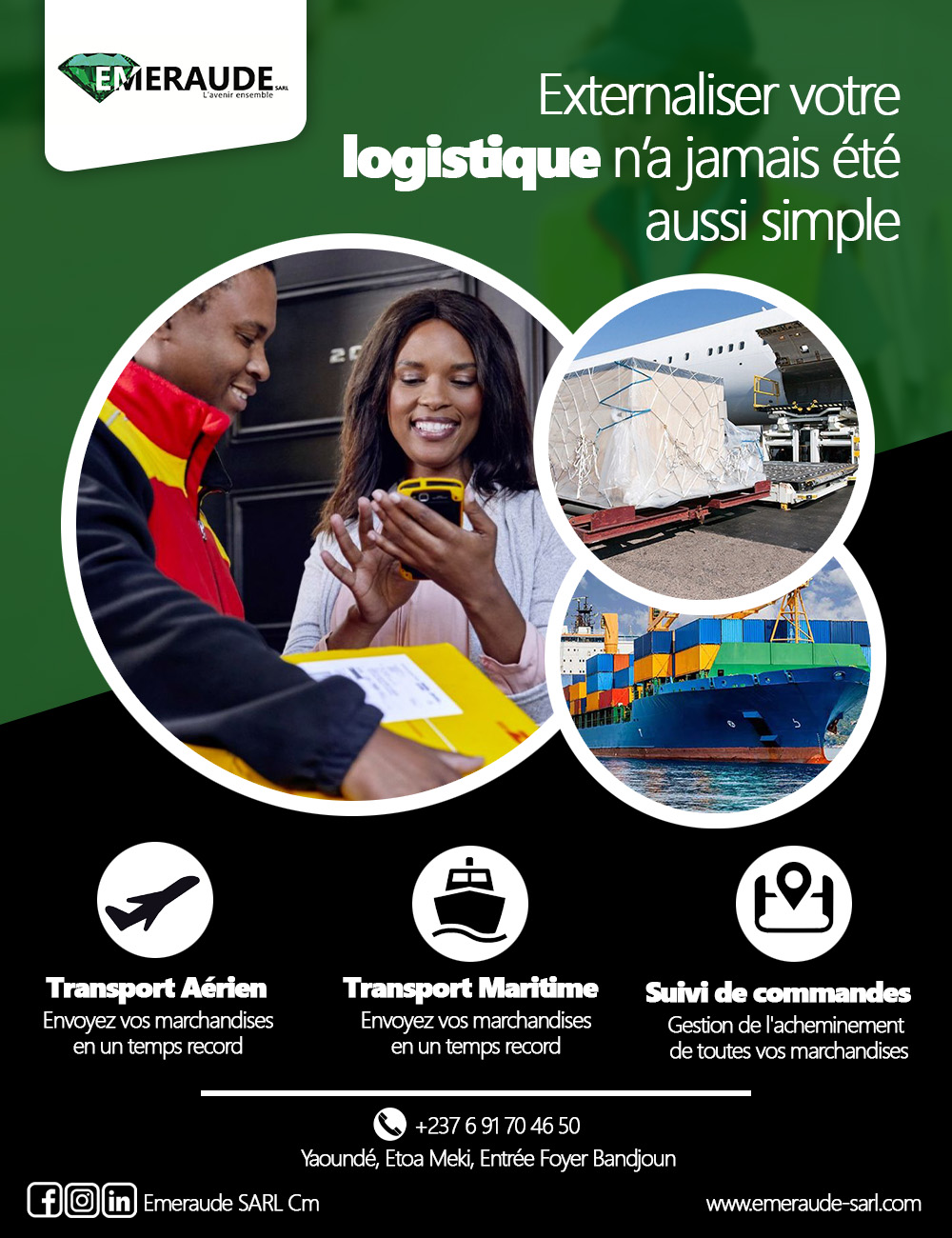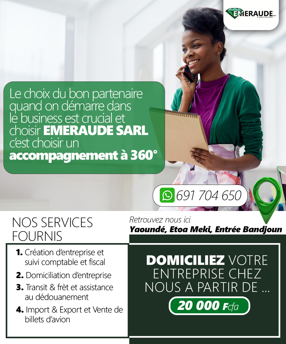 Né d’une jeune logisticienne et d’un cadre administratif et finance la société EMERAUDE est présente sur le marché des prestations de services et du Transit au Cameroun depuis le 01 juillet 2020. Le siège social est en pleine ville de sa capitale politique Yaoundé.