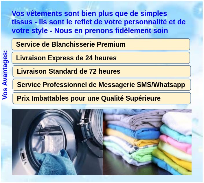 Nous sommes vos experts en soins du linge, dévoués à fournir des services de nettoyage de qualité supérieure qui laissent vos vêtements impeccables et sensationnels. ✨
